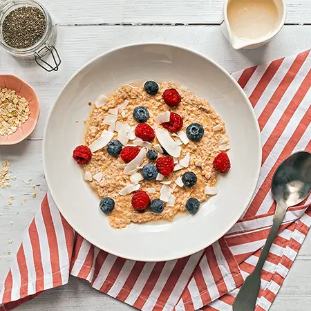 Our most recent go-to yellows recipe is these overnight oats. They’re great in the summer when you want oats but not a warm, steaming bowl of oatmeal, but they’re just as delicious in the winter when you want reassurance that summer really does exist. This recipe isn’t just good for your soul, it’s good for your body too. It satisfies our Head of Nutrition’s “PFC rule”: when making a balanced meal, aim to add at least one source of the 3 macronutrients, protein, fats, and carbs, for optimal satiety and energy.